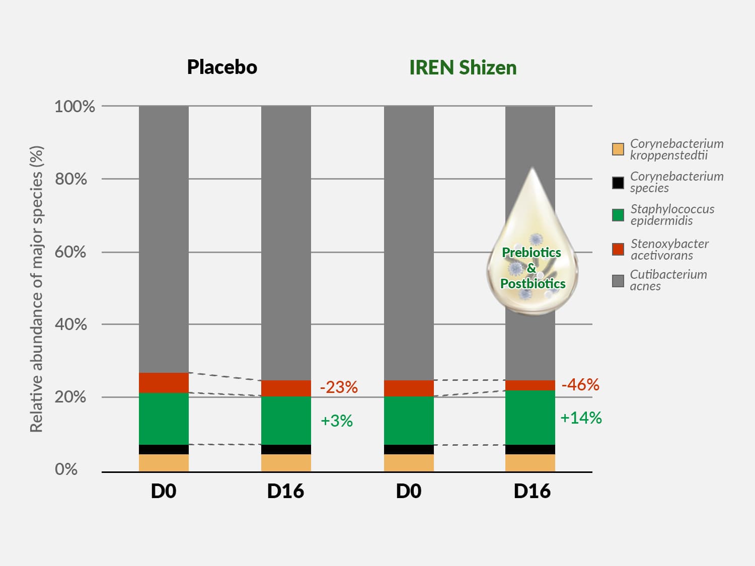 Un microbiome sain (bactéries qui vivent sur la peau) est essentiel pour se protéger contre l'inflammation et l'infection. Cependant, la plupart des produits de soins de la peau contiennent des conservateurs antimicrobiens qui éliminent les bonnes bactéries de la peau, entraînant une irritation et une sensibilité cutanées au fil du temps. Les prébiotiques et les postbiotiques peuvent aider au maintien et à l'équilibre du microbiome, aidant la peau à récupérer de ces ingrédients nocifs. Nos recherches ont montré de manière concluante que notre huile pour le visage est respectueuse du microbiome, ce qui signifie qu'elle ne perturbe pas l'équilibre des bactéries cutanées saines. Après seulement 15 jours d'utilisation, notre huile pour le visage a entraîné une augmentation significative de la croissance des bonnes bactéries, dépassant de loin le nombre des mauvaises souches et améliorant la barrière cutanée pour un teint sain